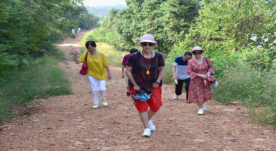 登山开始了,这是一群年过半百却不服老的“年轻人”,刚上山,山路缓坡,沙石轻滑,体力充沛,结伴而上,爬到三分之一,第一梯队脱颖而出,曾献华、付检生、商英杰、吴光辉、刘雄一直保持领先方阵爬上主峰,大汗淋漓,气喘嘘嘘后,稍事休整,陆续闻声见影,校长张玲带着大部队渐渐聚齐。